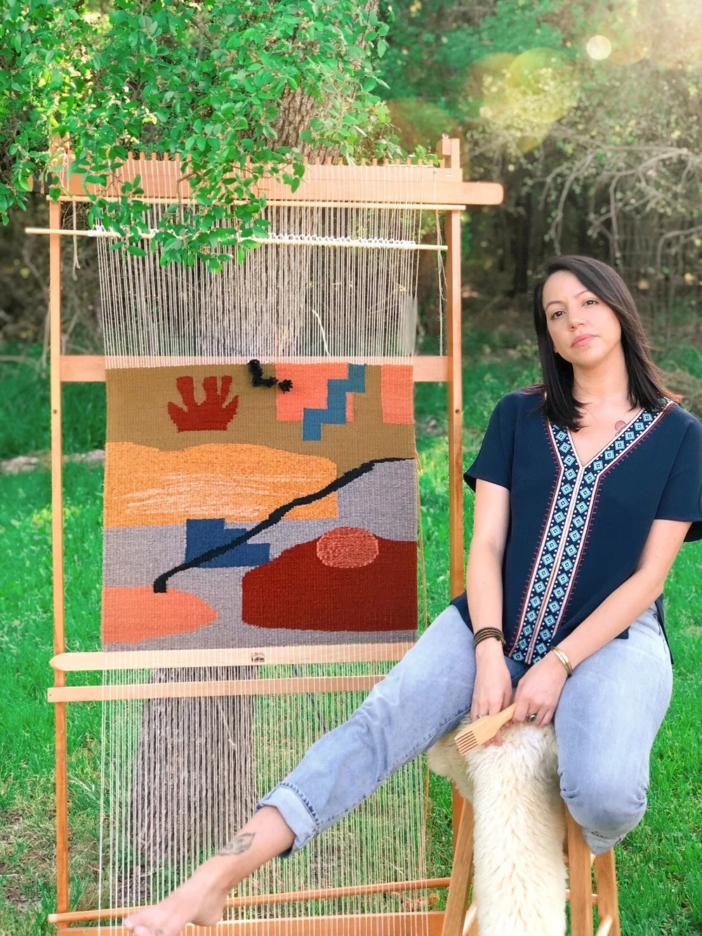 Denise Rosales was born and raised in Mexico, and she has been living here in Austin for three years. She’s a fashion and footwork designer, who graduated in 2014 from De La Salle Bajío (in Mexico), and she has been experimenting with general crafts (sewing, drawing, beading, knitting, embroidering) since she was around six years old. She began to get more involved in seed-beading a year ago when she was pregnant with her only child. She spends her time earning new techniques that use seed beads and discovering cultures from all over the world that use this art in their traditional clothing.
